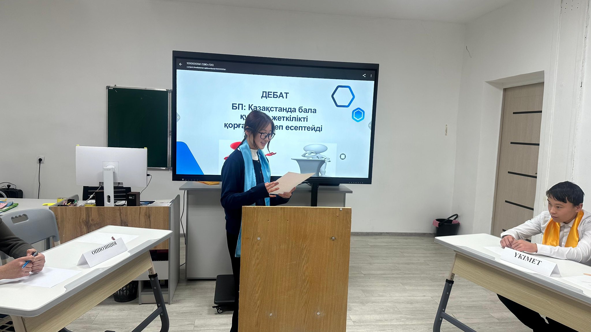 18 желтоқсан күні «Адал азамат» біртұтас тәрбие бағдарламасын іске асыру жоспарына сәйкес, «Ұшқыр ой алаңы» жобасы аясында заңды сақтау, құрметтеу және азаматтық міндеттерді орындау бағытында «БП: Қазақстанда бала құқығы жеткілікті қорғалады деп есептейді» тақырыбында дебат турнирі өткізілді.